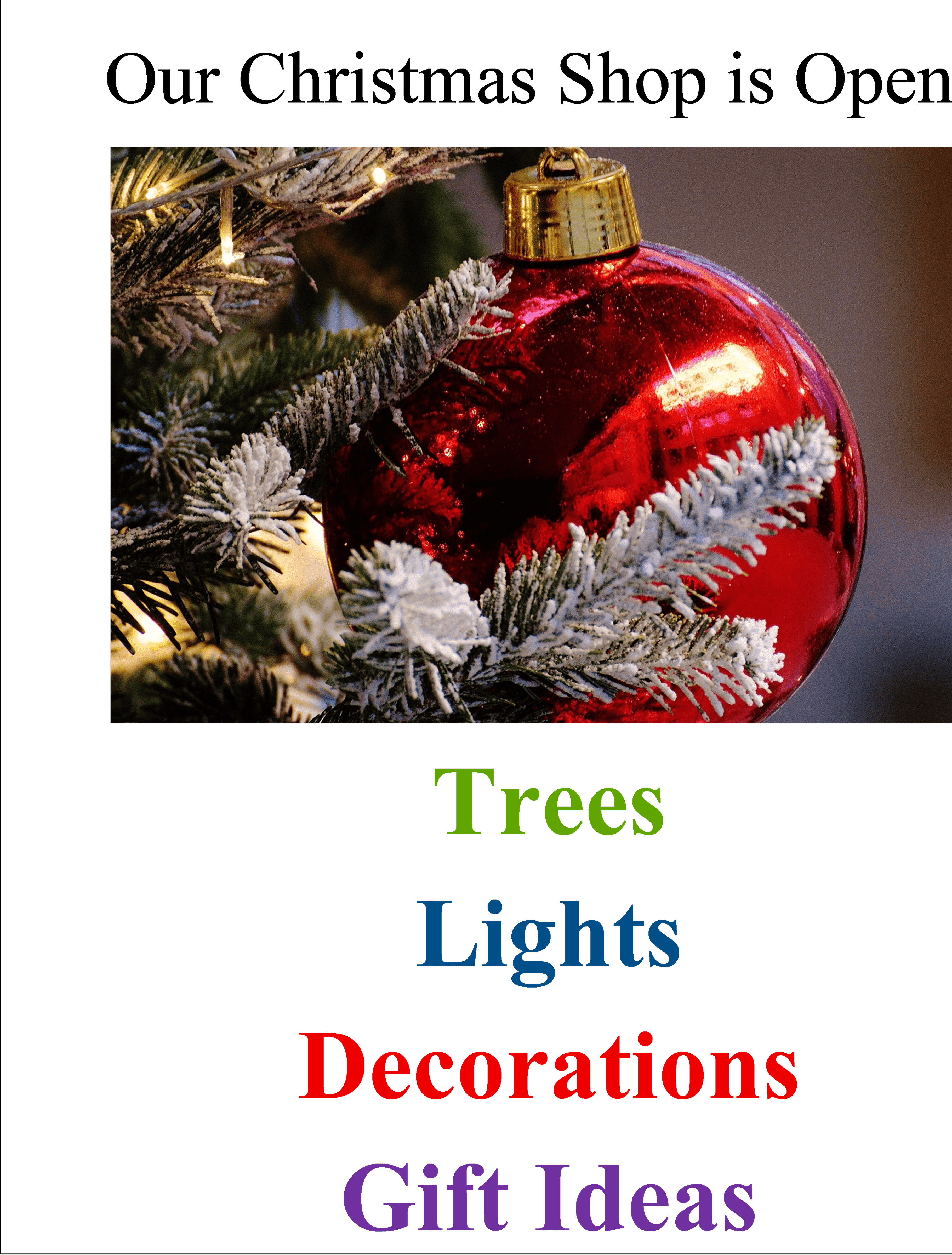 Our Christmas shop is now open for Trees, Lights, Decorations and Gift ideas